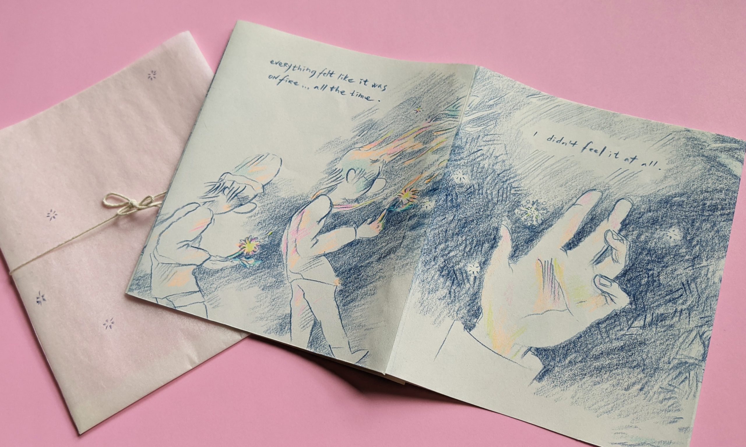 Originally made in 2023, drawn with pencil crayon on paper, and later reproduced as inkjet colour copies measuring approximately 6″ x 7″.